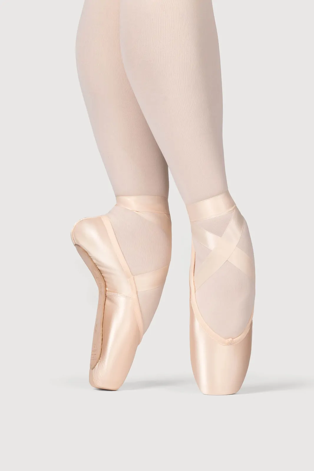 The Sonata pointe shoe shank/insole is not secured at the heel, with less resistance past the breakpoint the dancer will feel well supported and uplifted when 'en pointe'. Inside the box at the platform is a soft sponge cushion insert which gives added comfort and protection when standing 'en pointe' also acting as a shock absorber. This shoe actively supports the dancer with flexible arches under the metatarsals while still allowing the foot to arch at the three quarter. Fine cushioning under the pleats soften the sound of the box.