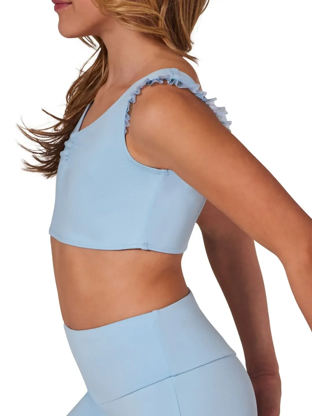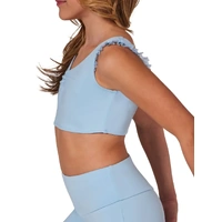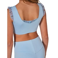 The Rosy Top from the limited edition Coming Up Roses collection brings a touch of elegance to any routine. This tank bra top features a charming pinched front and delicate mesh ruffle sleeves, with a sweetheart neckline both in the front and back. A playful mesh bow detail at the back adds a fun flair. Pairs perfectly with the Fleur Short.