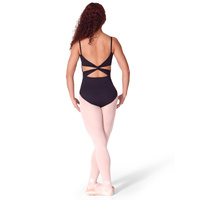 Stand out from the rest in the Camisole Leotard with Twist Back. This leotard stretches and twists like a dream. It features a self-fabric shelf bra for added support during every movement and a scoop front neckline and twist-back detail that will make you feel like a superstar on stage. The front empire seam adds a touch of glamour, while the moderate leg line keeps everything in place during your performance.