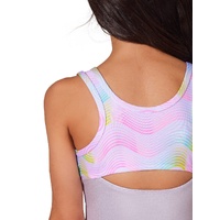 Capture the vibrant energy of golden hour with the Sunset Leotard from the limited edition Sunset Wave collection. This tank leotard, made from a Nylon and Lycra blend, features a stunning printed yoke on both the front and back, adding a pop of color. The scoop neckline and back create a sleek look, while the peekaboo back opening adds a playful, breezy detail. Perfect for expressing your inner glow, this leotard is ideal for performers looking to shine.