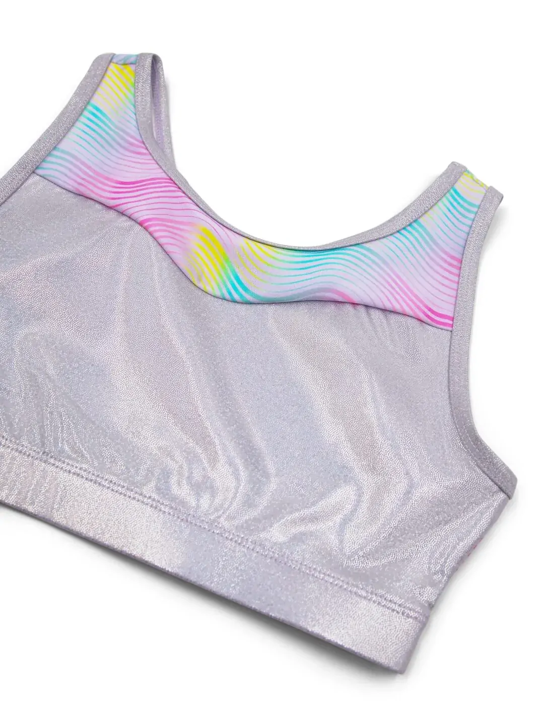Ride the wave in style with the Tropical Top from the Sunset Wave collection. Made from a flexible blend of Nylon and Lycra, this top offers the perfect combination of comfort and shimmer with its foil fabric accents.