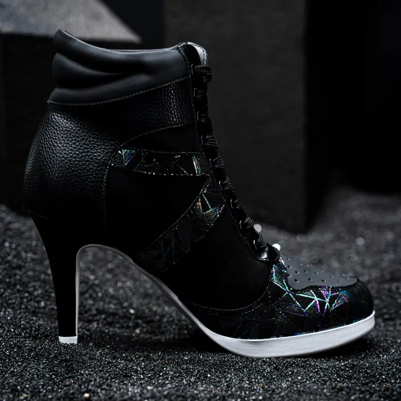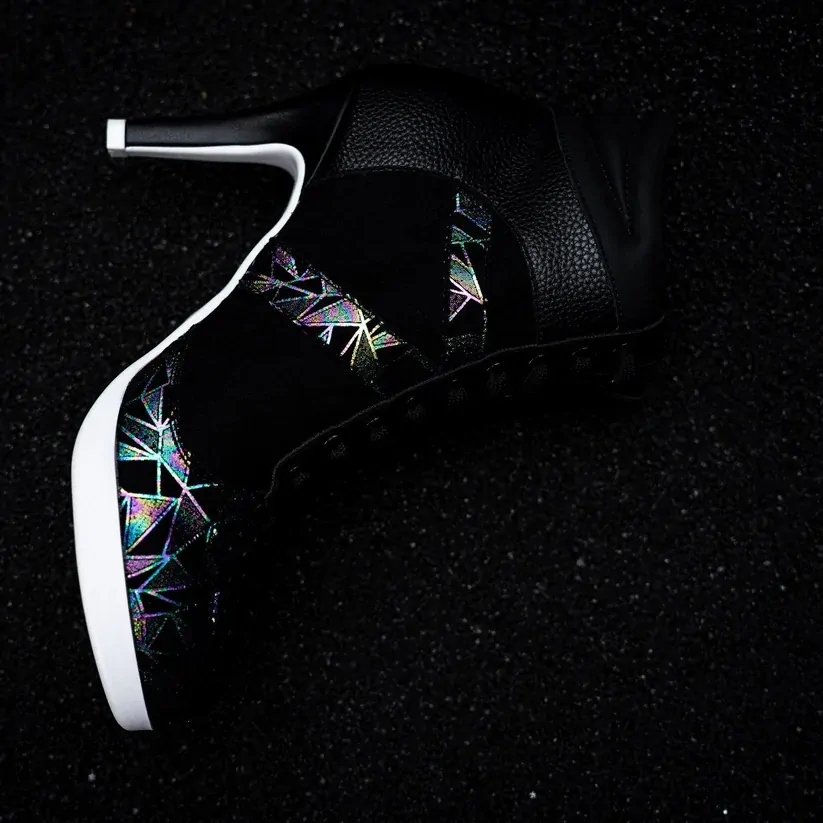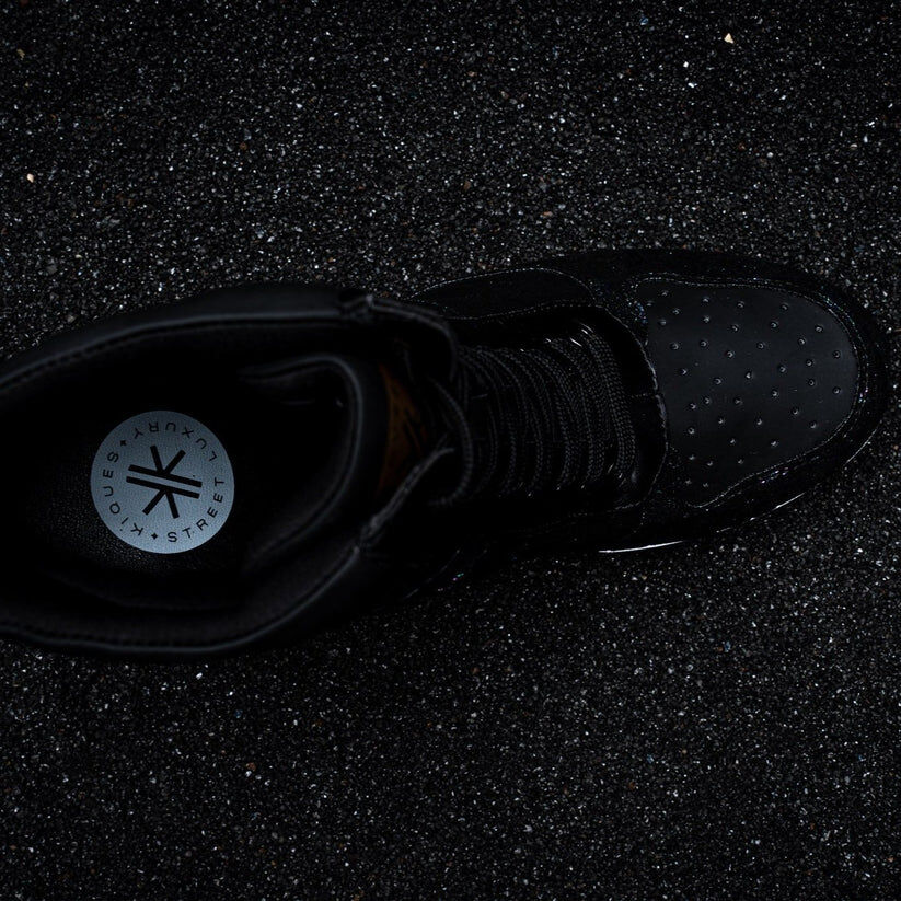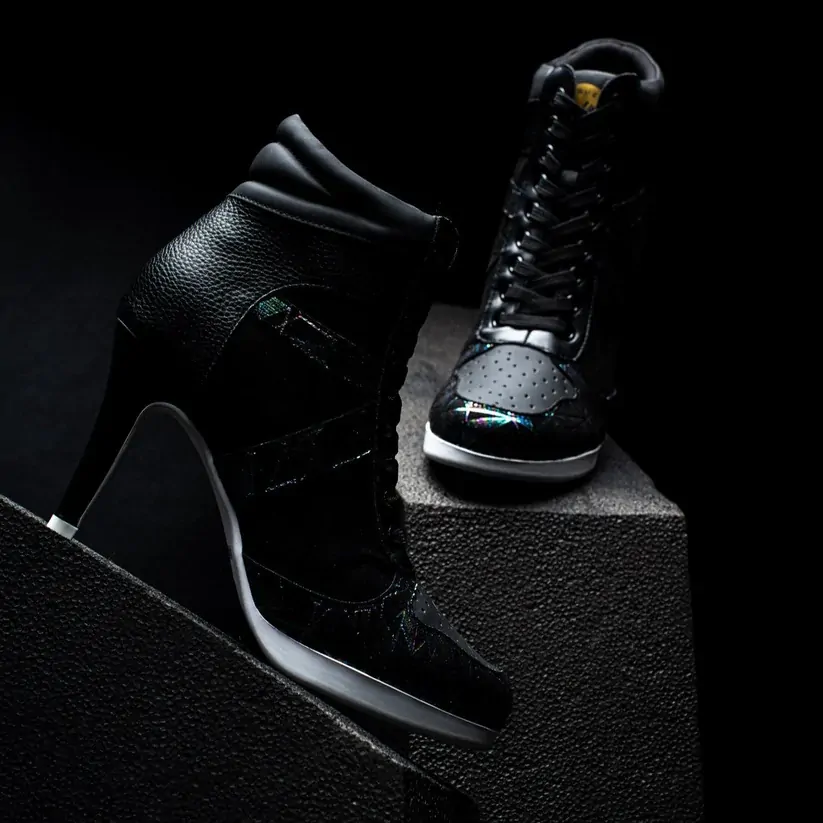 Kiques Oniques in Black is a High Top, urban sneaker high heel made for women who enjoy getting dolled up but are street-style by nature. You will receive your Kiques Oniques in a black colour matched Tote Bag instead of a regular shoe box to add an additional accessory option for your outfit.
