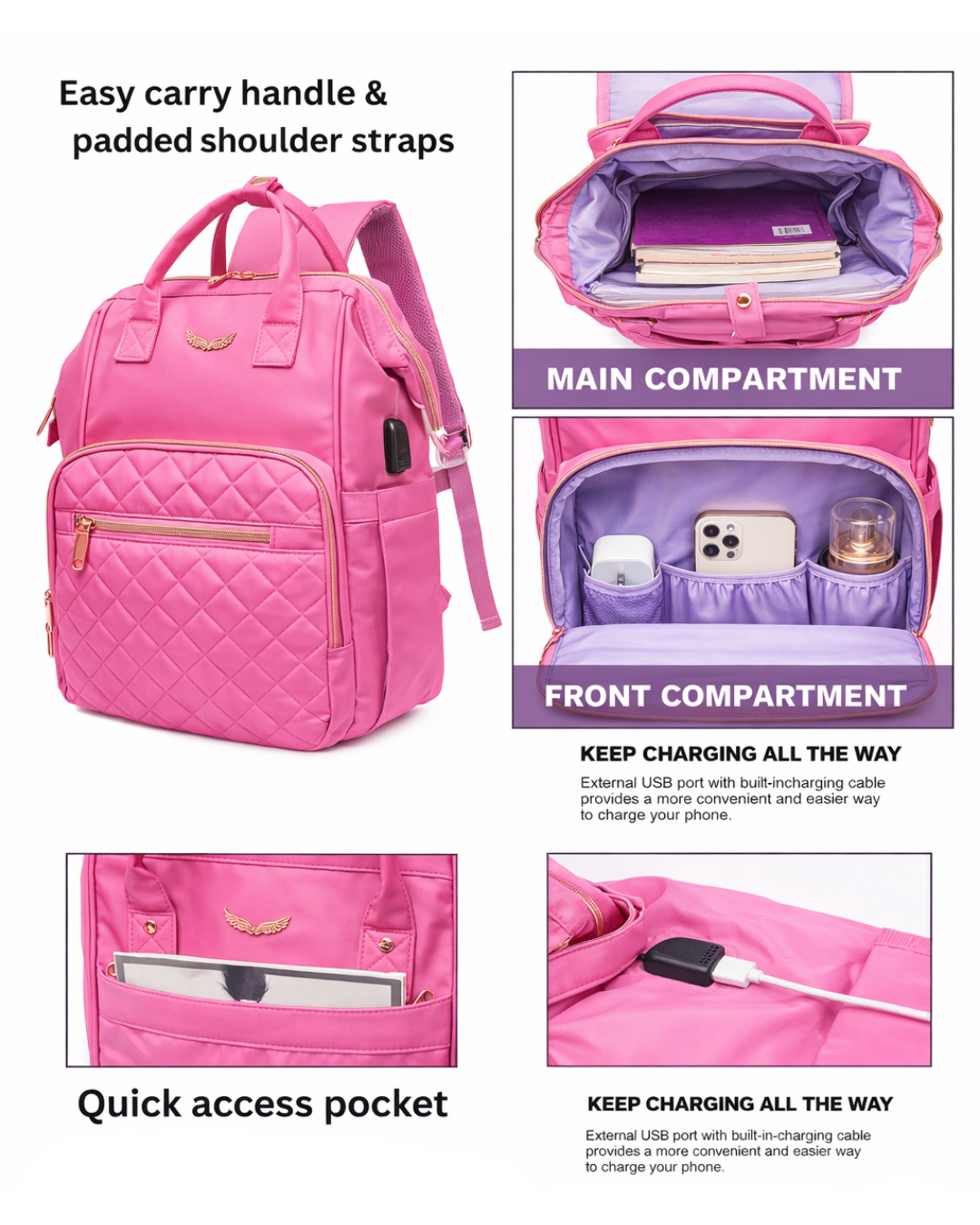 Lap top divider inside the bag so your lap top fits securely. A wet pouch inside the bag for any moist items of clothing or liquid bottles. With USB Charging port.