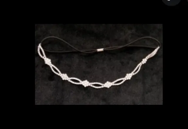 This stunning headband features delicate diamontes across the front; with a black elastic cord on the back to hold it in place. One size only.