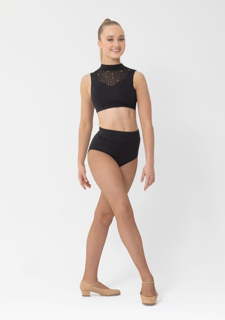 This simple yet stunning costume crop features diamante diamond patterned mesh, and open back.