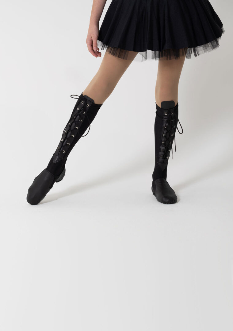 The perfect accessory to your commercial or jazz costume. These lace-up spats finish under the knee, and fit comfortably inside your dance shoe.