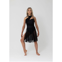 Featuring a high-neck mesh detail that sweeps elegantly across the bodice, this design creates a modern asymmetrical look while offering secure coverage. A mid-length sheer mesh skirt flows effortlessly over a built-in leotard base, complete with side splits for added fluidity and expression.