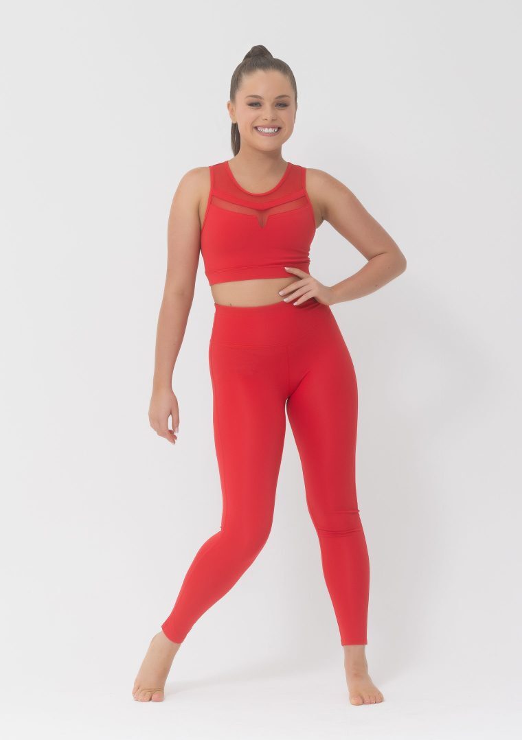 Eye catching crop with mesh cutout design and double strap feature offering versatile style with support and comfort.