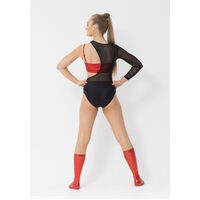 A striking mesh leotard suitable for a range of dance genres. With it’s interesting one sleeve design and large scoop cut out on the opposite side, this leotard lets you wear a crop top of your choice. Wear a matching colour for an all-over uniform look, or show off your crop in a bright or contrasting colour.